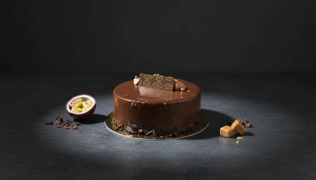Dásamlega samsetningu af súkkulaðimús, ferskum passion-kjarna og stökkum karamellubrownie-grunni. Hjúpuð með dökku súkkulaði-ganache fyrir algjöra sælu.