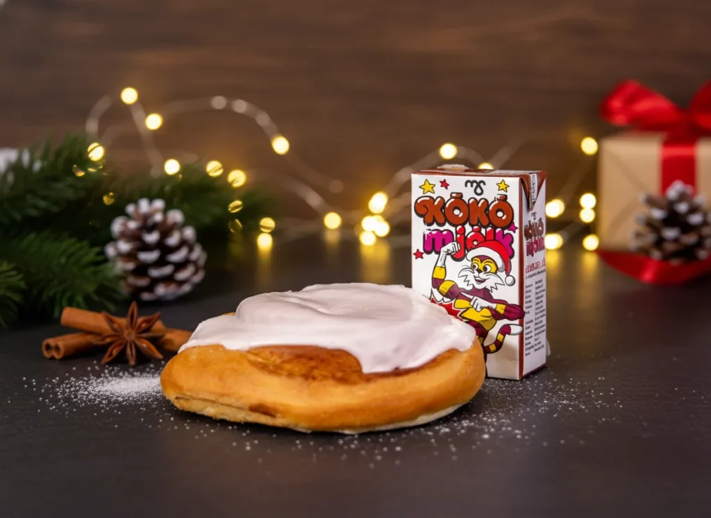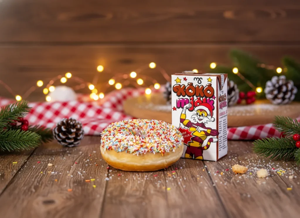 Gefðu gleði og hlýju með klassískum kleinuhring og ískaldri kókómjólk frá Almar Bakara – fullkomið augnablik fyrir alla aldurshópa.