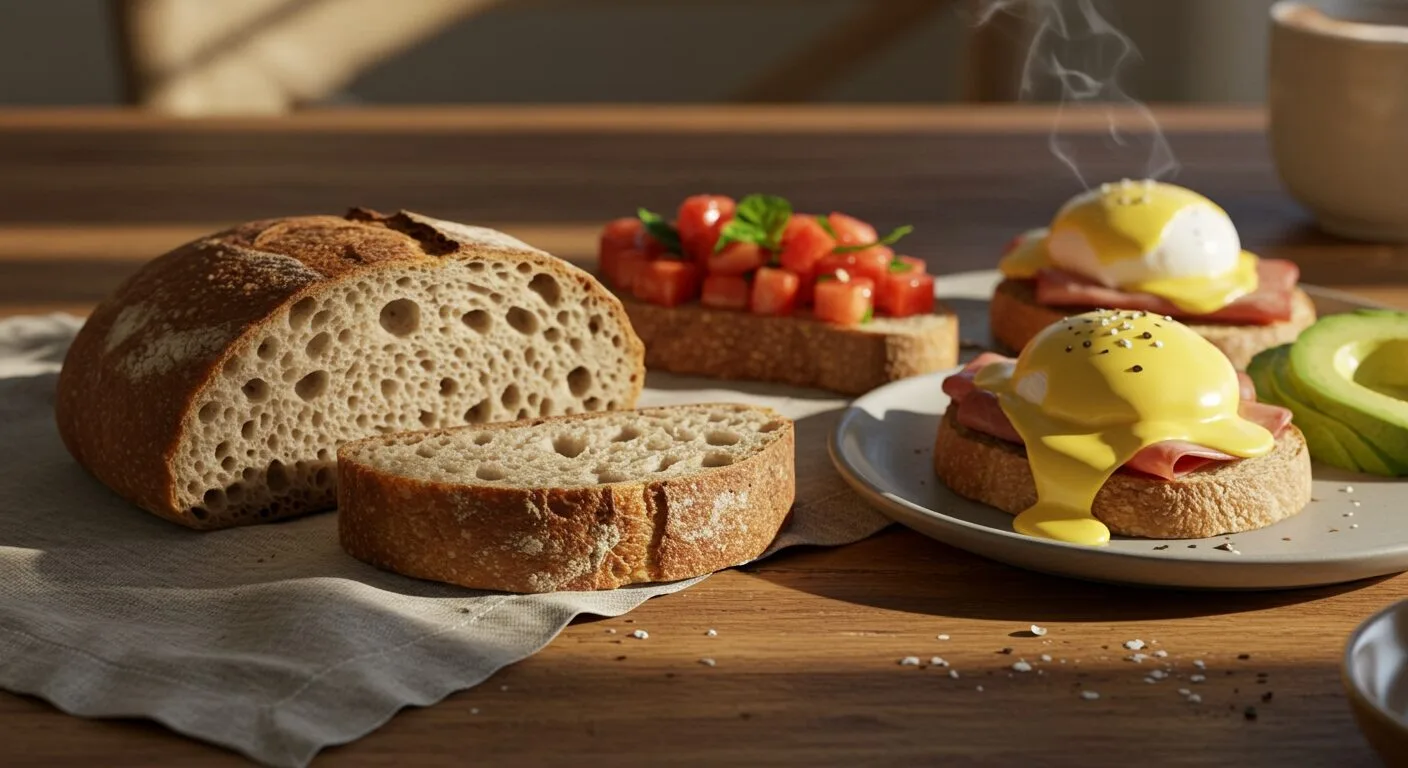 Fyrir þá sem vilja gera vel við sig og bjóða upp á eitthvað aðeins fínna, er Egg Benedict frábær kostur. Hefðbundið er það borið fram á enskri múffu, en við lofum ykkur því að súrdeigsbrauðið okkar tekur þennan rétt upp á nýtt stig. Stöðugleiki brauðsins og bragðmikil skorpan veita fullkomna andstæðu við ríka eggið og hollandaise sósuna.