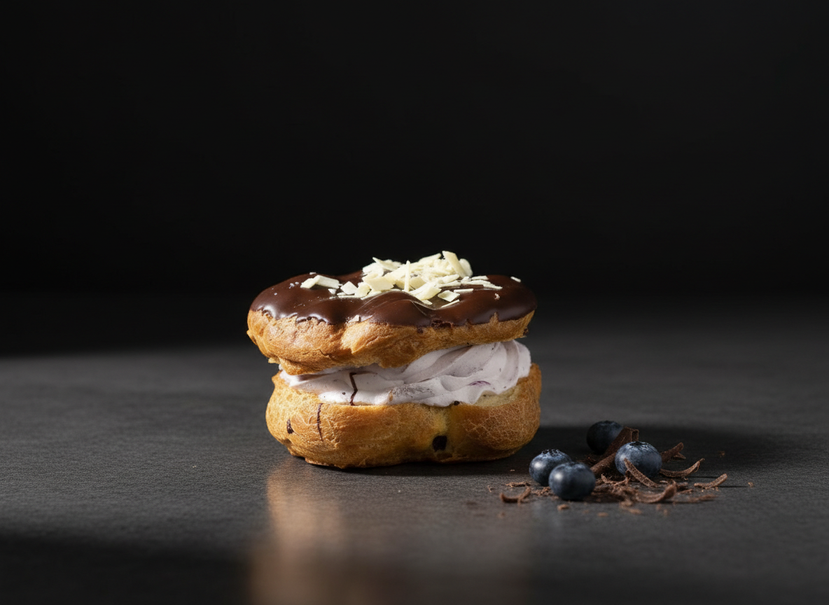 Vatnsdeigsbolla, bláber, rjómi, toppað með súkkulaði.