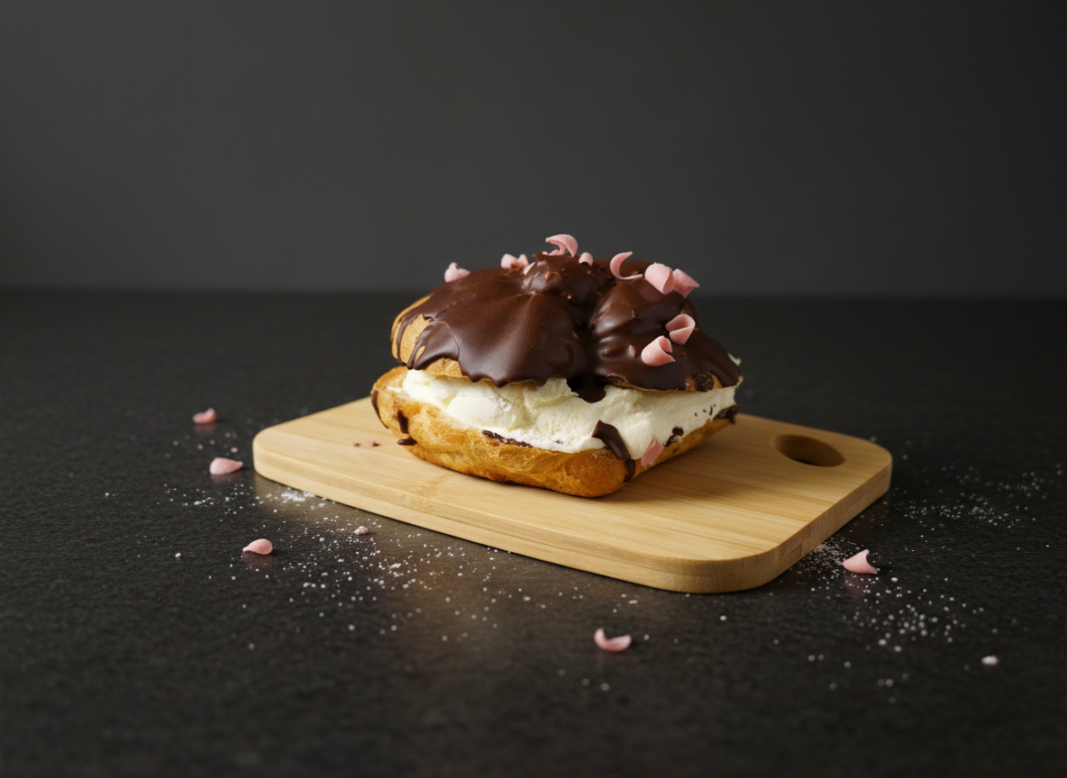 Vatnsdeigsbolla, rabbarbarasulta, rjómi, toppað með súkkulaði glassúr.