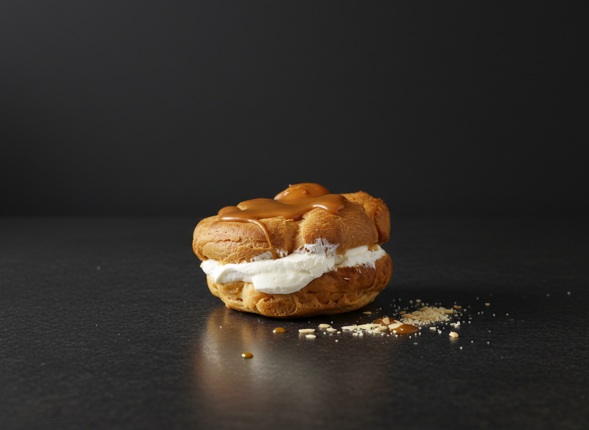 Vatnsdeigsbolla, karamella, rjómi, toppað með karamellu glassúr.