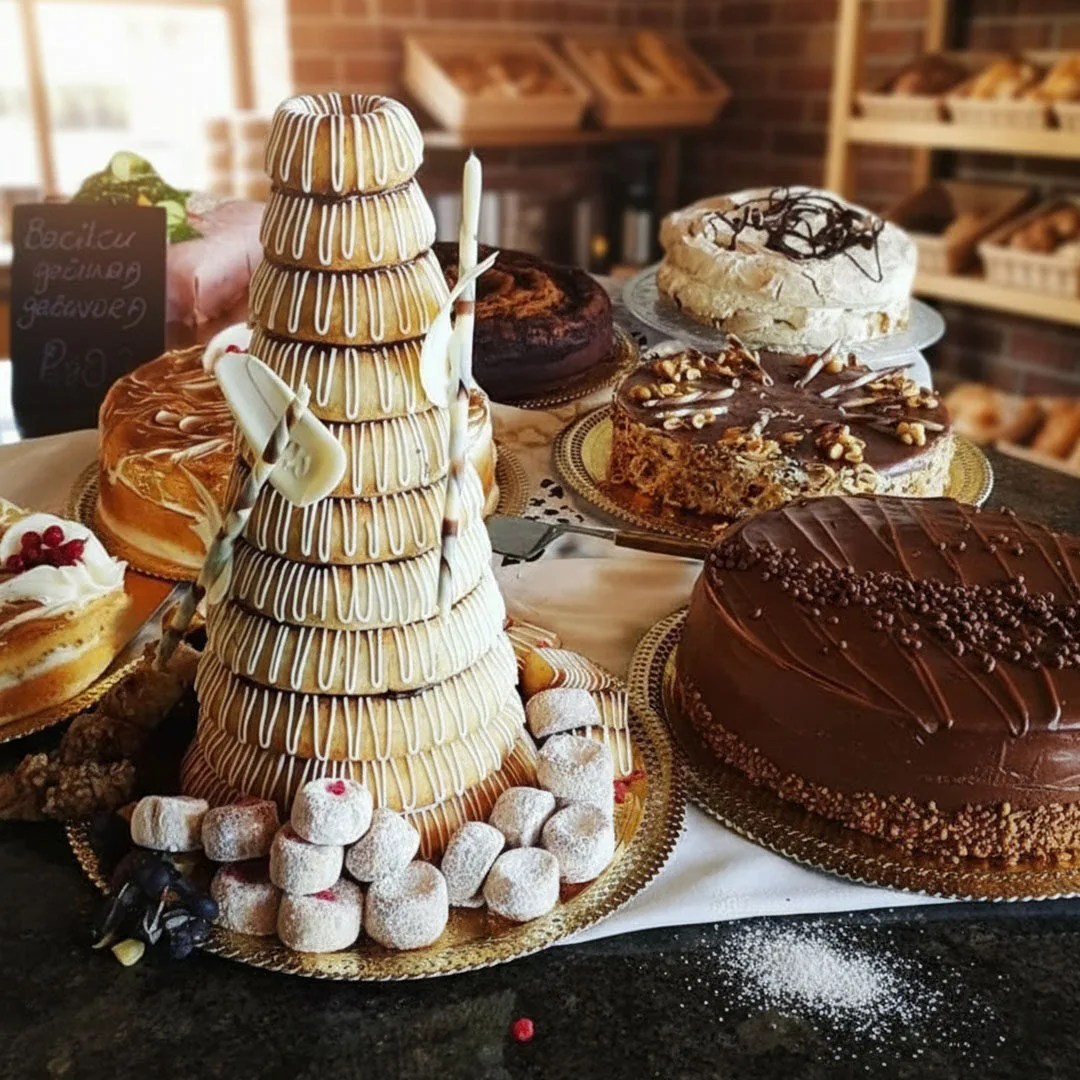 Klassísk og glæsileg kransakaka, fullkomin fyrir allar hátíðarstundir. Bökuð af alúð og skreytt af natni, tákn um hefð og gleði.